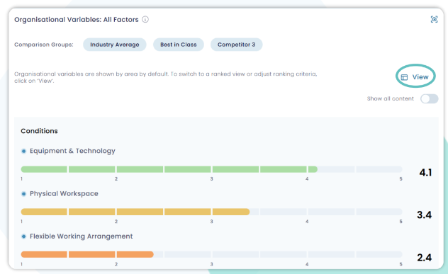 of organisational variables which influence employees’ work experience and productivity. By default, the widget shows factors grouped By Area. Switching to the Ranked View lets you