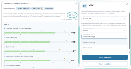see all factors compared to each other. Factors can be ranked by absolute score or by the gap to a selected comparison group (e.g., Industry Average).